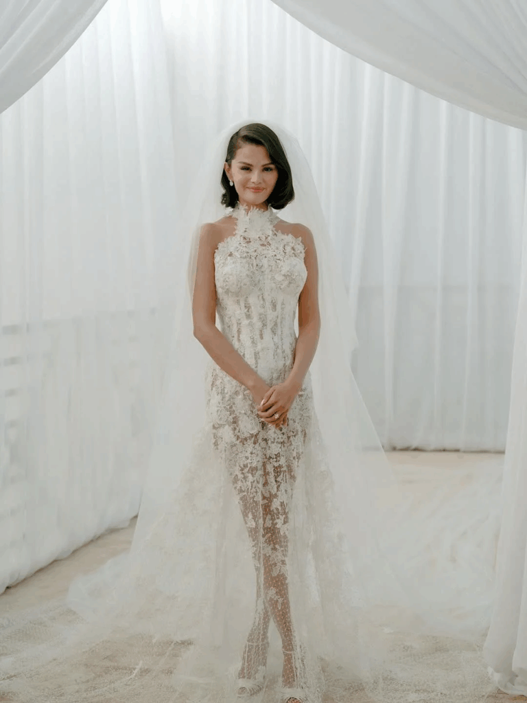 Horas después, fue Benny Blanco quien reveló en redes sociales el segundo vestido nupcial de Selena, también de Ralph Lauren Collection. Este diseño de encaje de seda, adornado con 300 flores moldeadas a mano y más de 200 horas de bordado artesanal, reflejaba un aire romántico y delicado. El corsé pintado a mano resaltó su silueta, mientras que un íntimo detalle robó corazones: un corazón bordado con las iniciales “S + B” y la fecha de la boda.